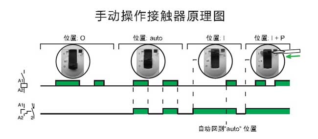 ·手動操控的接觸器在其前端面有4個位置選擇開關:自動操作模式;臨時“開”;永久“開”: 用于鎖定安裝維護過程中處于“開”位置的接觸器;關斷狀態